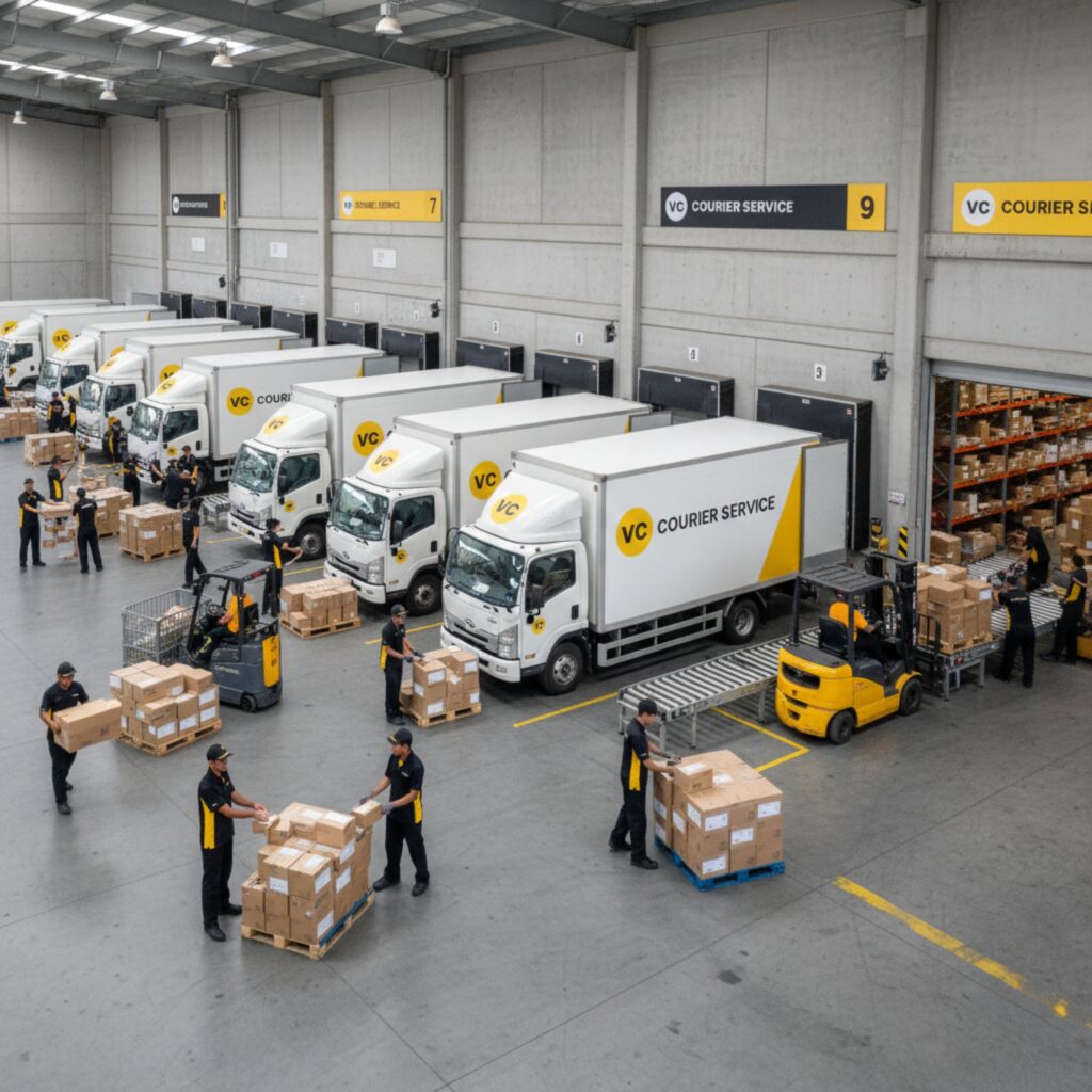 modern courier service operation inside a large distribution warehouse. Multiple branded delivery trucks are docked at loading bays while workers efficiently handle packages and pallets, highlighting streamlined logistics and professional supply chain management.