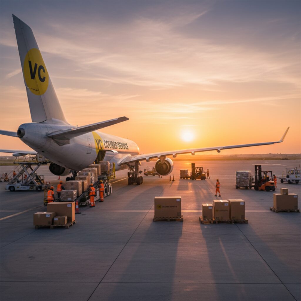 efficient air cargo operations at sunset, featuring a courier aircraft being loaded with palletized shipments on the runway. Ground crew and forklifts coordinate seamless freight handling, showcasing fast international shipping